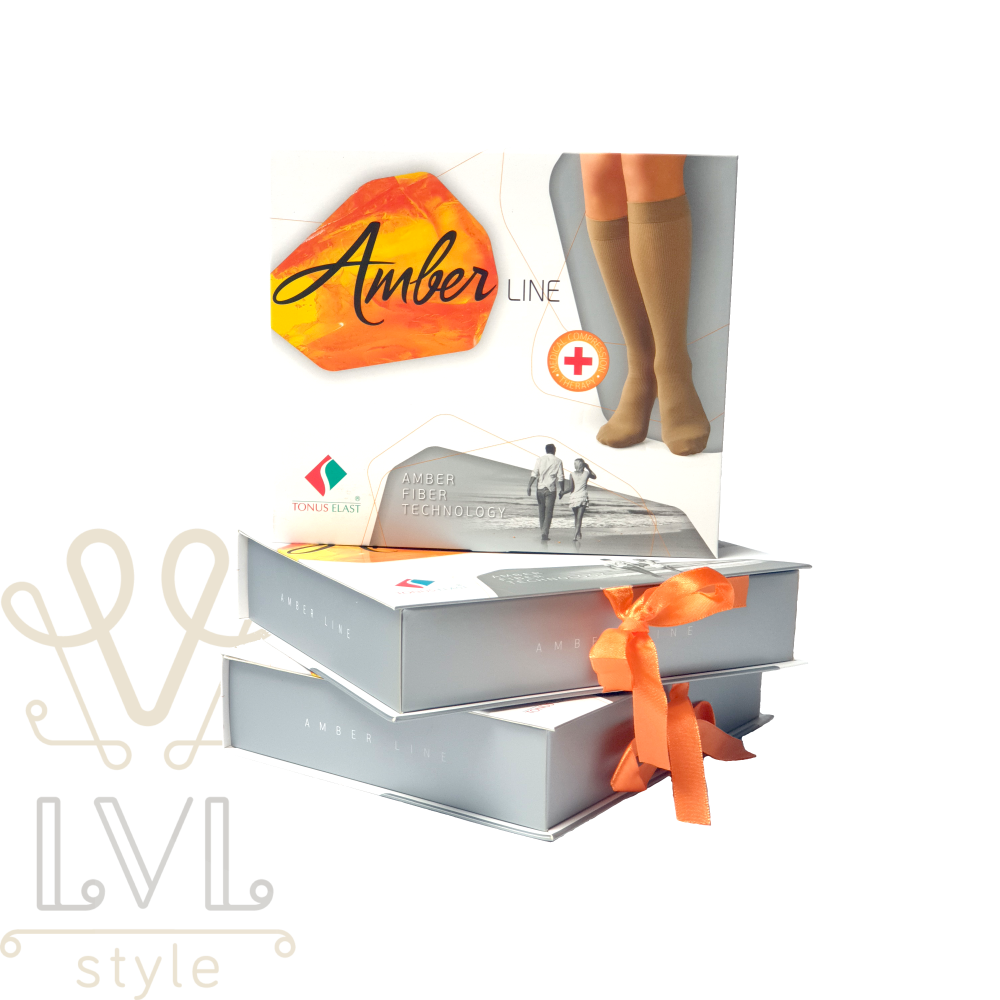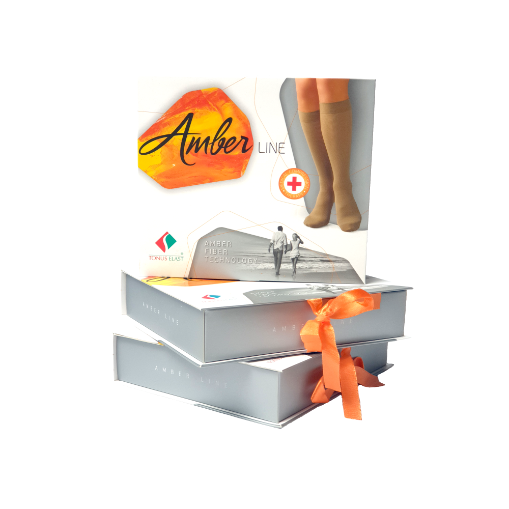 Elastische lange sokken voor medische compressie met neus, gemaakt van polyamide-composietgaren met amber microdeeltjes, unisex.