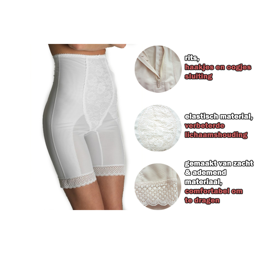 De elastische medische Figuurcorrigerend ondergoed voor post-partum heeft een hogere dichtheid in het dijgebied. Het is bedoeld om de buikwand na de bevalling te ondersteunen, evenals voor de herstelperiode na verschillende soorten trauma en operaties in het buikgebied. Het voorste deel van de riem is gemaakt van niet-elastisch kant en helpt de buikwand te ondersteunen. Het gebruik ervan vermindert spanning in de rug en verlicht pijn in de onderrug. Het elastische materiaal draagt bij aan de vorming van een elegante figuur, door de omtrek van de heupen, dijen en buik te verminderen. De verhoogde lijn aan de bovenkant van de riem, verder versterkt door een elastische band, helpt bij het verkrijgen van een slanke taille. De strakke pasvorm van het product op het lichaam creëert een algehele indruk van een goed onderhouden figuur.